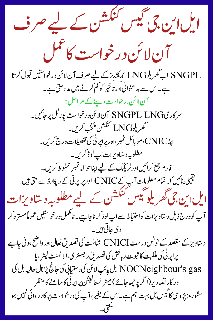 In Apply Online for New Domestic Gas Connection 2025, SNGPL has completely revised its domestic gas rule. The most significant change remains the shift from natural gas to LNG for all new residential influences.